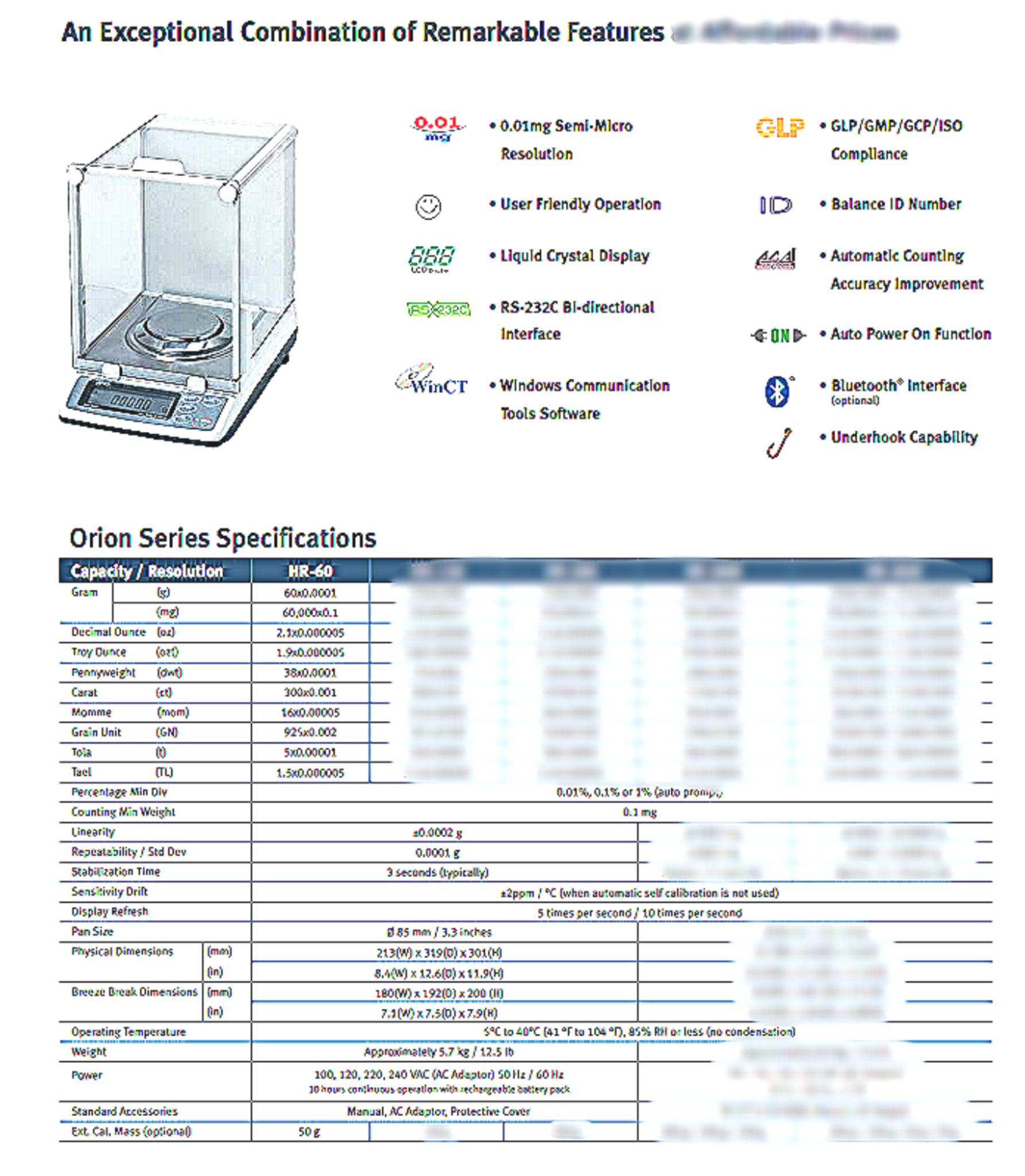 The entire HR Series are high quality analytical balances featuring external calibration & made in Japan. Forget those overpriced Switzerland made analytical balances that cost double, triple or quadruple for what? Some of the European Balance manufacturers overcharge you for their balance and then to top it off they "lock out" the ability to perform an external calibration unless you call their service tech. Not A&D, they know if you're smart enough to purchase a high quality lab balance and save $1000's over the European Brands then you can simple press "one button" and place the optional 50 gram calibration mass on the platform to perform your own calibration. The HR-60 analytical balance offers an exceptional combination of remarkable features at affordable prices. 60 gram capacity weigh capacity with 0.1mg readability, 13 weighing functions, percentage and counting modes also! Read all the specifications in detail and even download the HR-Series instruction manual to help you with your buying decision.