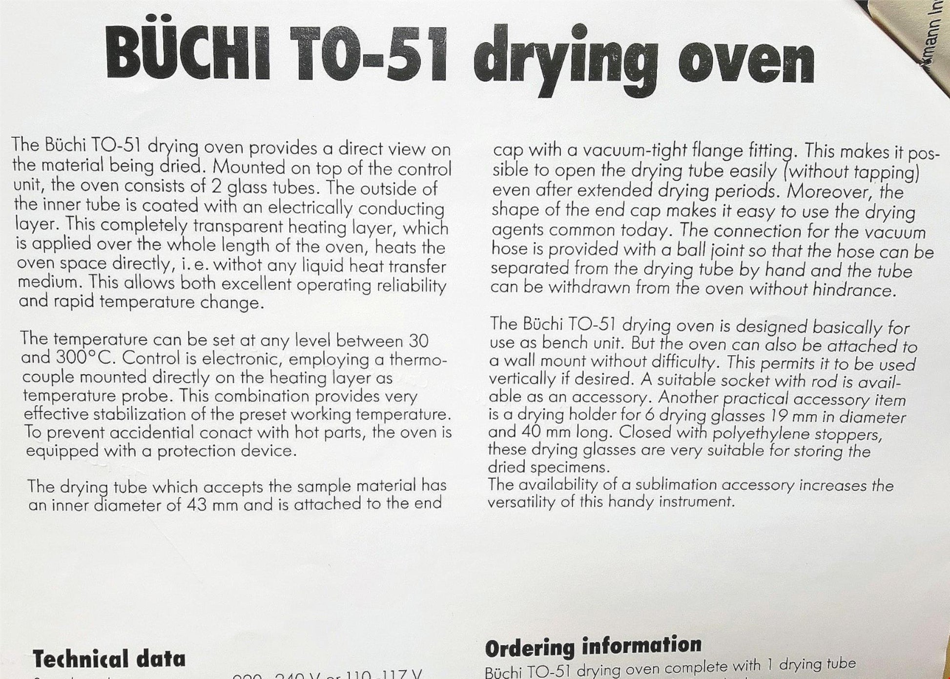 This glass tube oven consists essentially of two concentric tubes of borosilicate glass mounted in the holder. The heating is accomplished by a totally transparent electrically conducting semiconductor layer vaporized on to the exterior of the glass tube