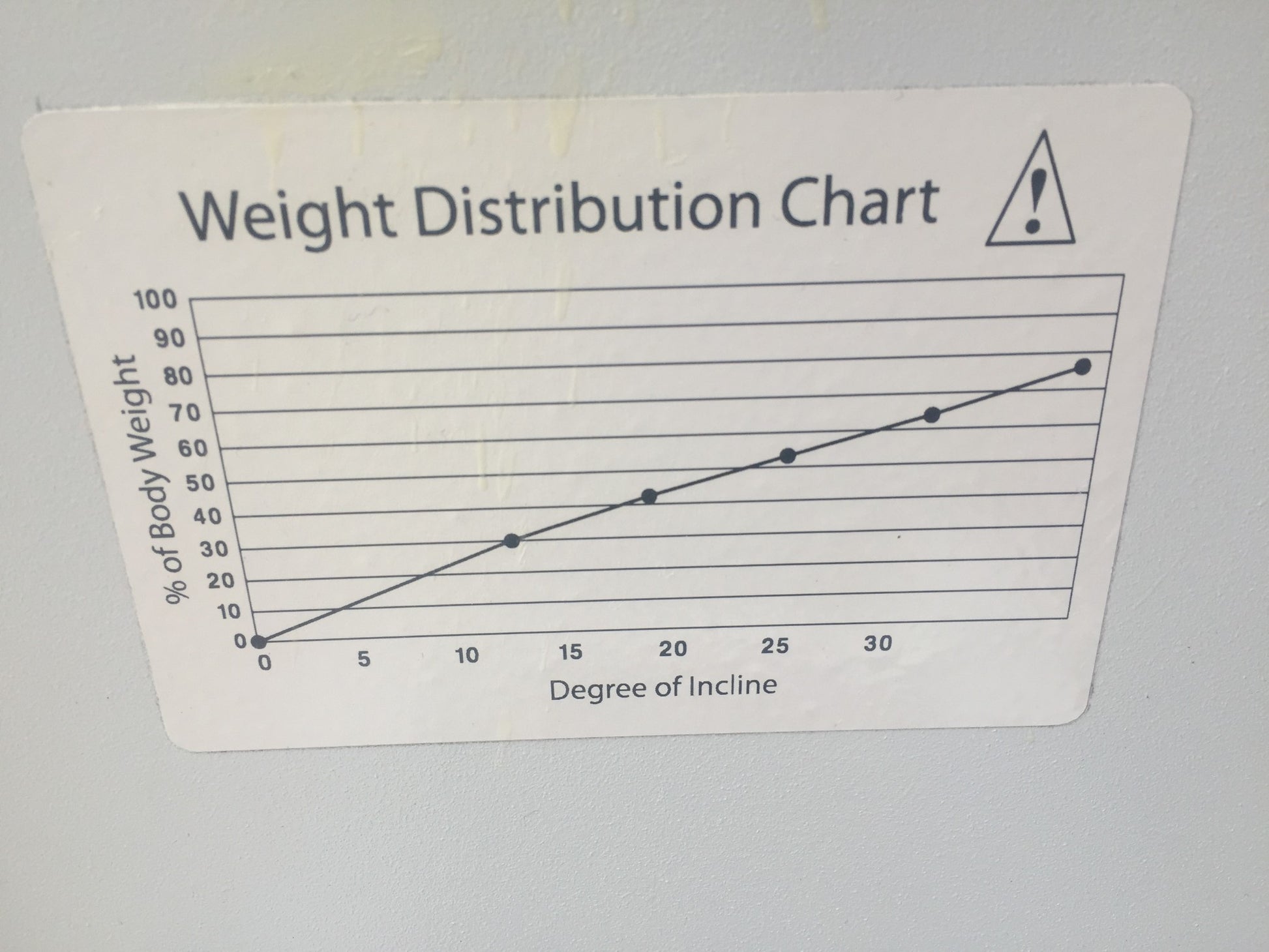 Weight distribution chart provides a quick reference of degree of incline versus percentage of body weight