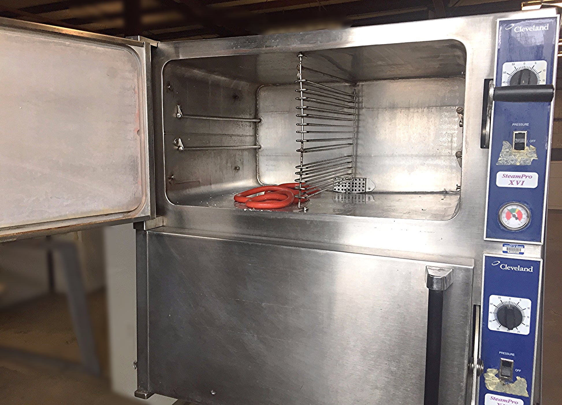 Two Compartments, CLEVELAND Pressure/Convection Steamer, Direct Steam, Model 36-PCDM. Pressure/Convection Modes to be selectable at user’s option with no restrictions as to any combination of modes.