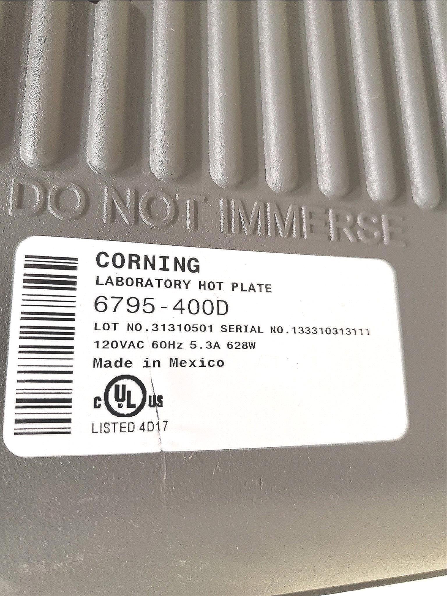 The Corning hotplate 6795-PC 400D has a digital LED temperature display in degrees C, a 5 x 7 inch glass-ceramic plate surface, a microprocessor-based temperature control unit, and a U.S. three-prong plug that works with a 120V/60Hz power source. This hotplate is used by researchers, professionals, and hobbyists to heat a variety of liquids and solutions in chemistry, food and beverage, biology, lab, and home applications. This Corning hotplate has an illuminated power indicator. Its temperature display blinks until set temperature is reached. The glass-ceramic plate surface is scratch, corrosion, and chemical resistant, and has good cleaning ability. Its two-piece casting design deflects spills from the electrical area, and includes a built-in rod mount support. An angled front panel minimizes damage from spills, and a large knob allows control. A microprocessor-based control unit maintains consistent and repeatable temperature settings of 5 to 550 degrees C (+ or - 2 degrees C), adjustable in increments of 5 degrees C. The device can work with a temperature controller and support rod (sold separately). Overall dimensions are 4.25 x 7.75 x 11 inches (H x W x D). (H is height, the vertical distance from the lowest to highest point; W is width, the horizontal distance from left to right; D is depth, the horizontal distance from front to back.) The 6795-PC 400D meets European Standards (EN).