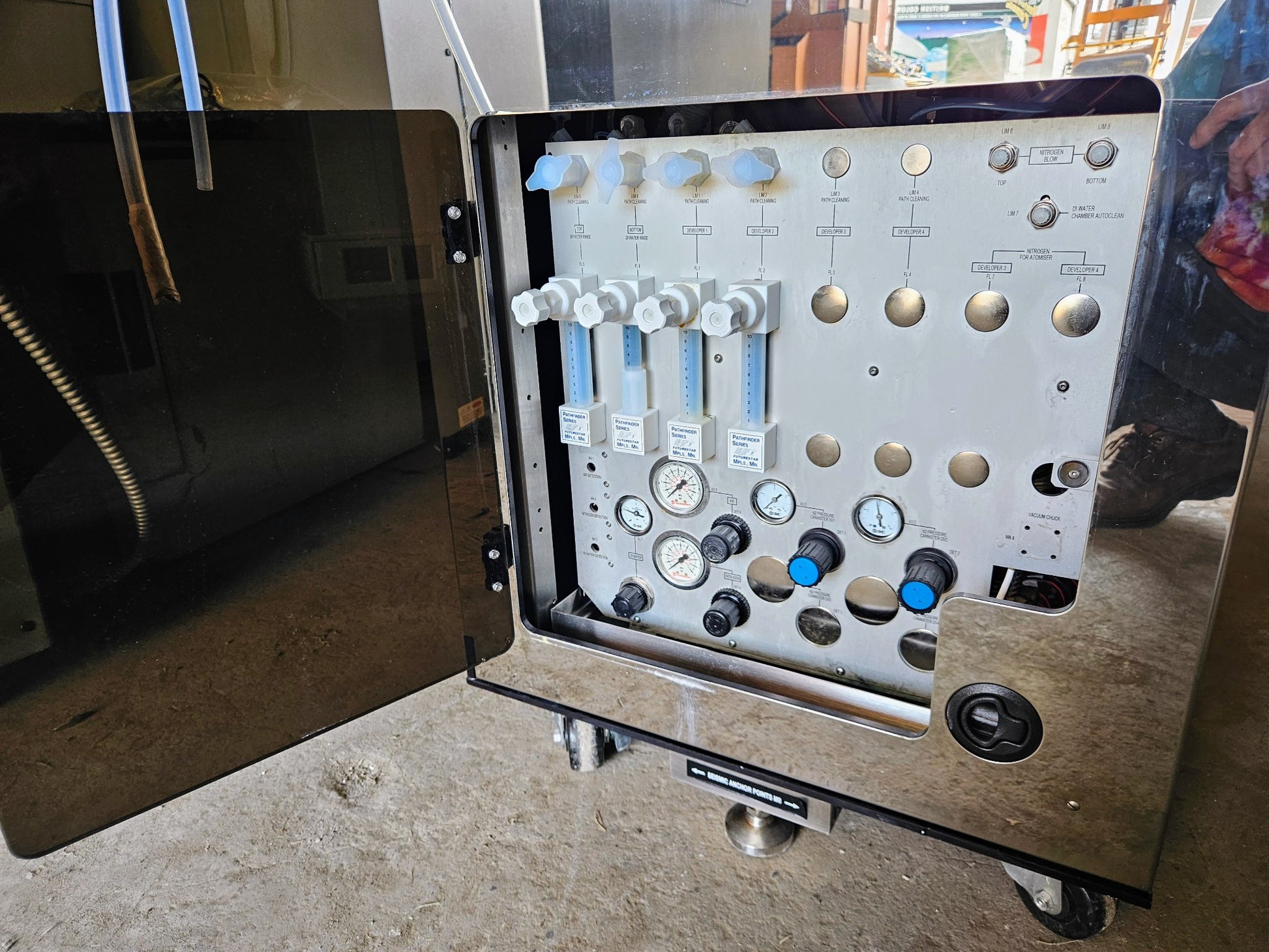 Additional Information: This Photoresist Coating, Baking, Vapor Prime, Stripping and Developing System includes an RC-8 Spin Coater, Back Side Rinse Arm, Spray Develop Module, Hot and Cold Plate Ovens, HMDS Vapor Prime Chamber, Karl Suss iEi PAC-106GW-R21 Industrial Computer, Lindberg Blue BF51894C-1 Furnace, Fully Automated GENMARK GENCOBOT Robot Handling, Neslab FTC-350 and all that is seen in the pictures related to this unit.