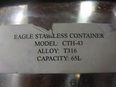 You are bidding on a used EAGLE MODEL CTH-43 STAINLESS STEEL CONTAINER 65 LITER IN WONDERFUL COSMETIC & OPERATIONAL CONDITION AS YOU CAN SEE FROM THE PICTURES.