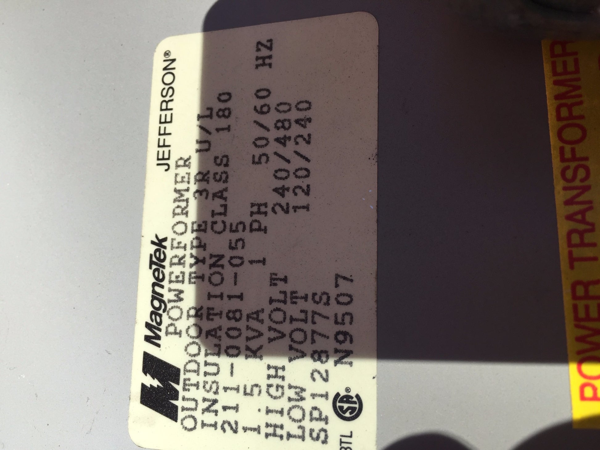 Identification Plate Reads: "KVA 30 HV 480 LV 240/120 340 wt lbs".