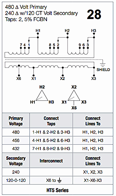 This is a 30 KVA transformer with a 480 DELTA primary and a 240 Volt DELTA secondary with 120 Volt tap.