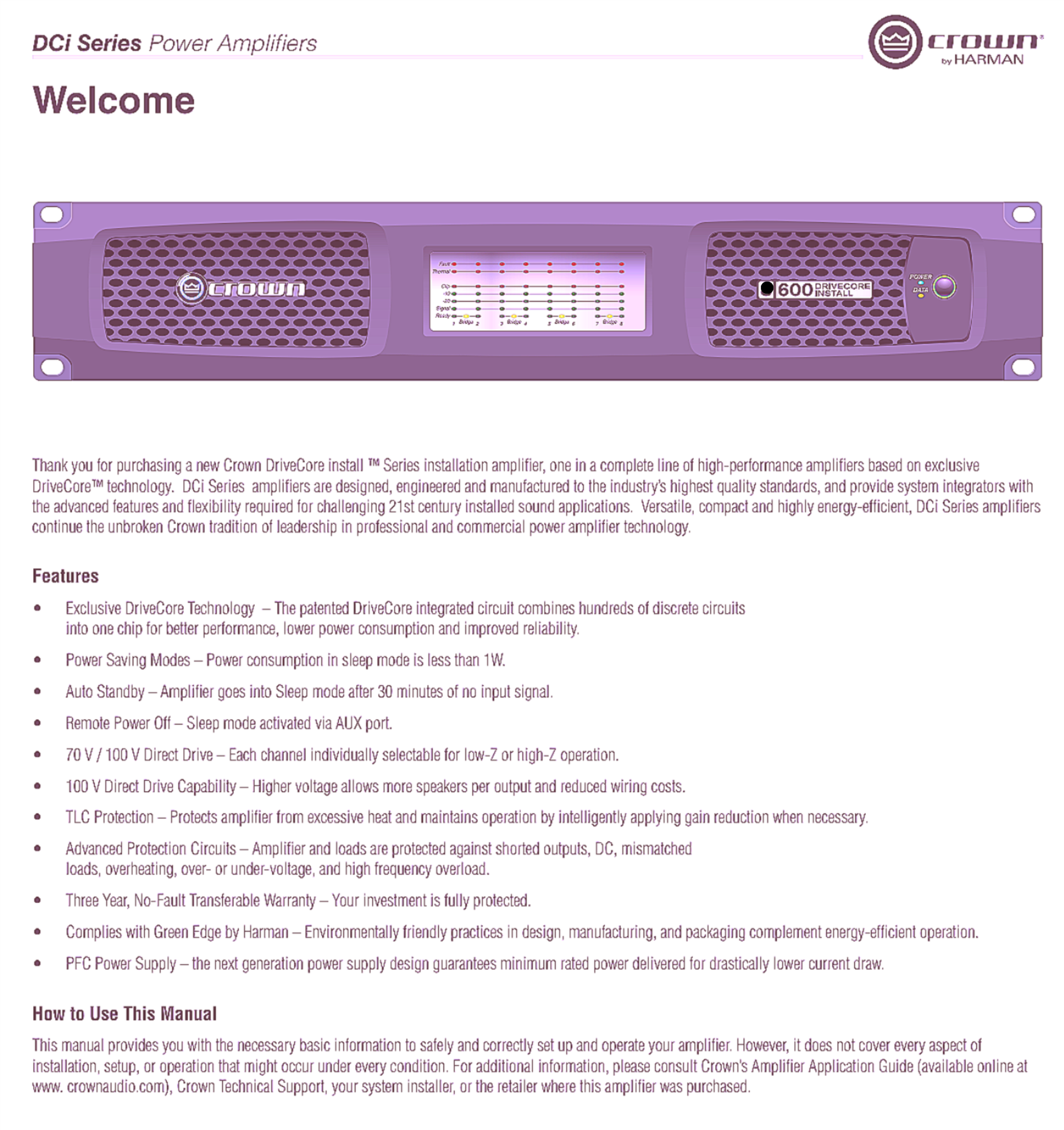 IMPORTANT: THE OPERATIONAL MANUAL WILL BE INCLUDED WITH THIS Crown DCi 4|600 / 4-Channel Power Amplifier, 600W at 4 Ohms, 70V!!!!