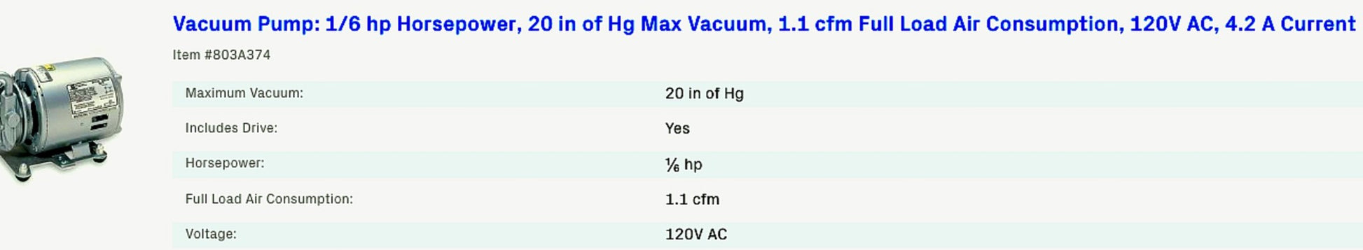 1/6 hp Horsepower, 20 in of Hg Max Vacuum, 1.1 cfm Full Load Air Consumption, 120V AC, 4.2 A Current