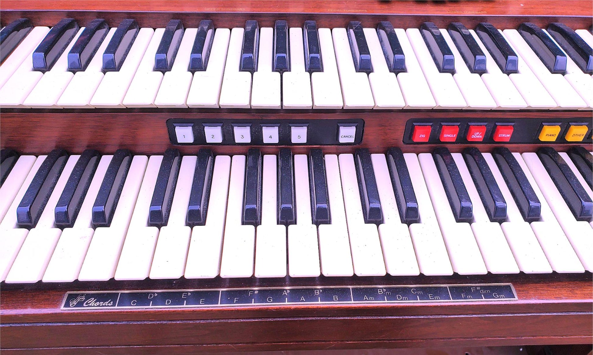 o 16'and 8' Tonebars, Pedal Sustain, Bass Guitar. Pedal Mute. Lower to Pedal