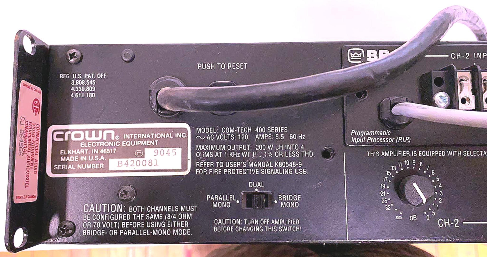 This listing is for a PERFECT OPERATIONAL CONDITION HARMAN CROWN COM-TECH 400 POWER 400W 2 CHANNEL AMPLIFIER as can be WATCHED IN THE VIDEO and also seen in the pictures.