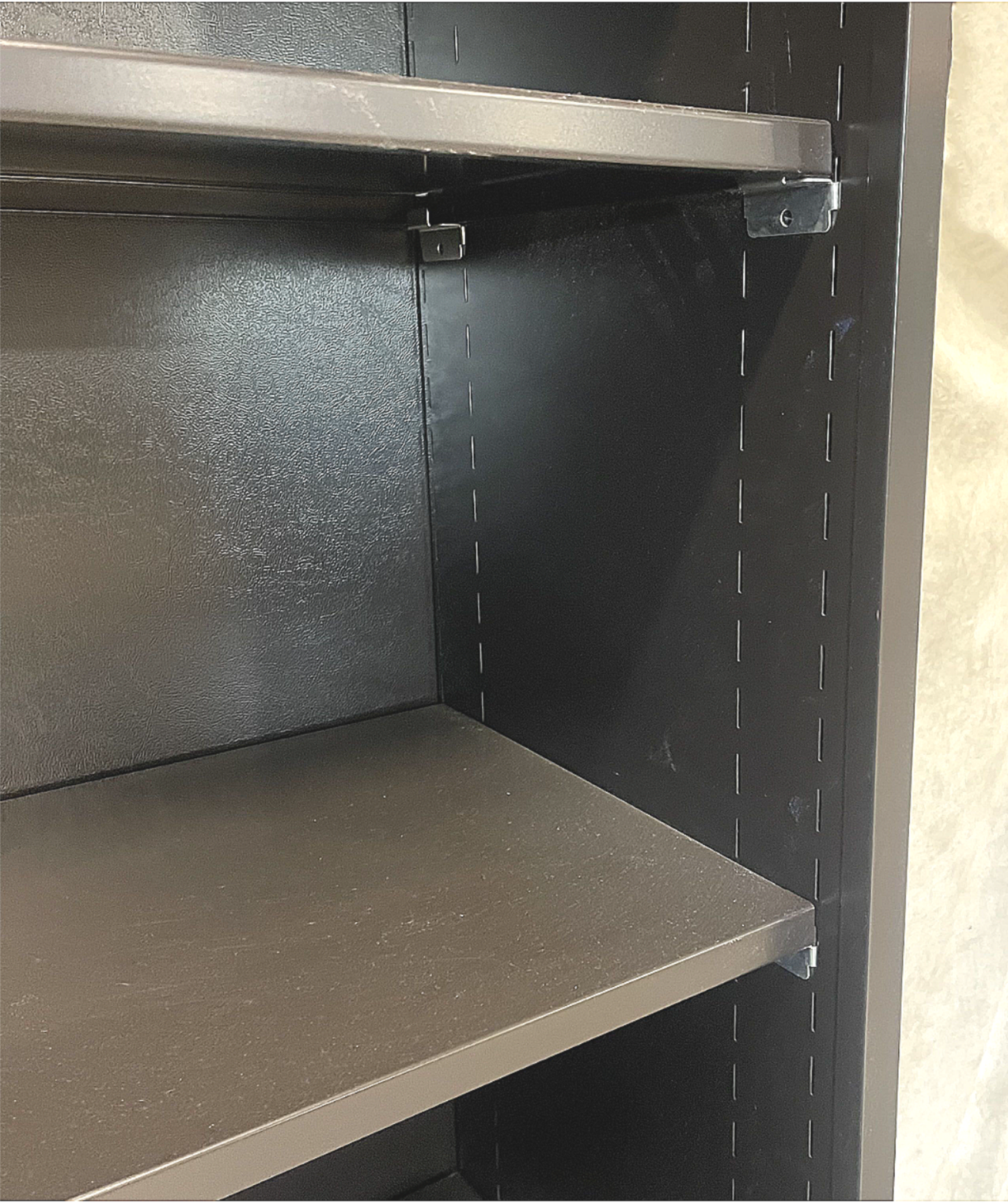 Manufacturer: Herman Miller Model: 46-3615-OB-68 Type: Freestanding Color: Black Material: Metal Style: Closed Shelving Count: 5 Shelves Table Top: With Wood Top Physical Dimensions Width: 36" Depth: 15" Height: 68.5"