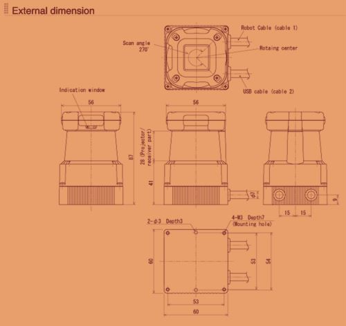 Feel free to check manufacturer's technical data on this HOKUYO UTM-30LX SCANNING LASER RANGEFINDER by GOOGLING the following link: https://www.hokuyo-aut.jp/search/single.php?serial...