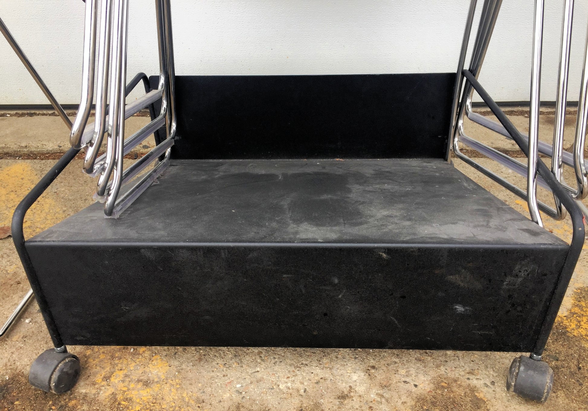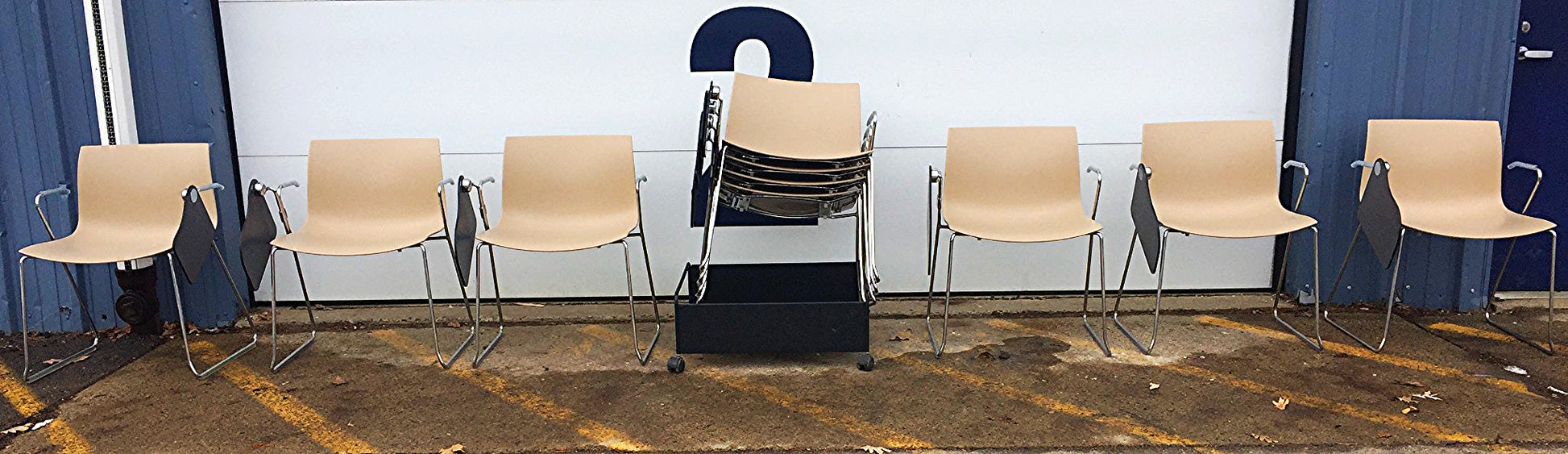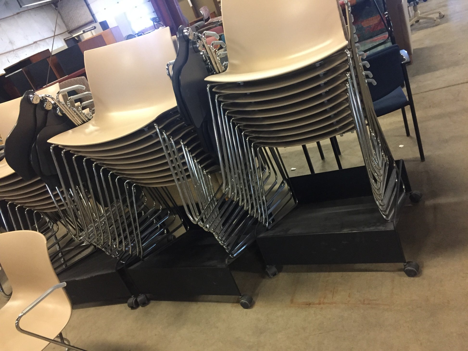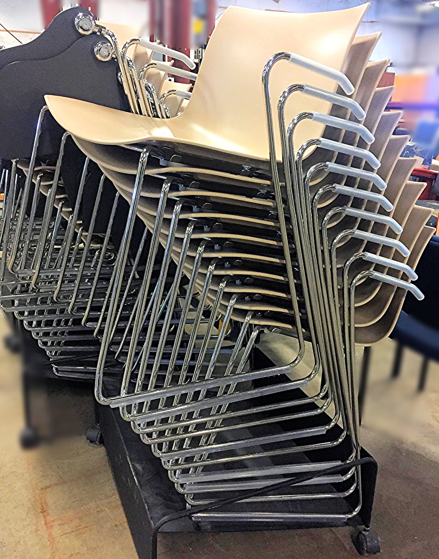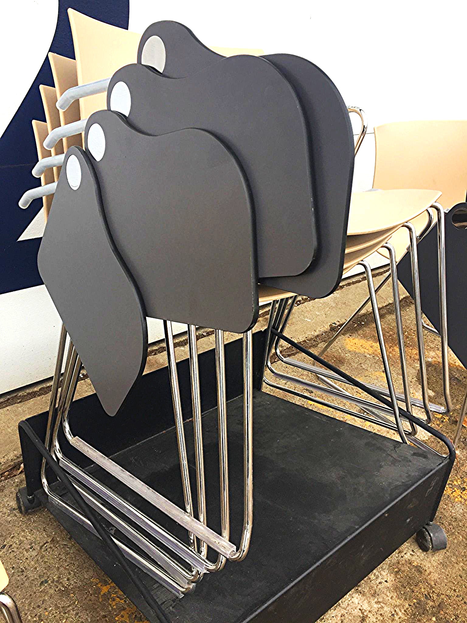 This listing is for 10 chairs & a Metal Base on Wheels in Great Condition as can be seen in the pictures.