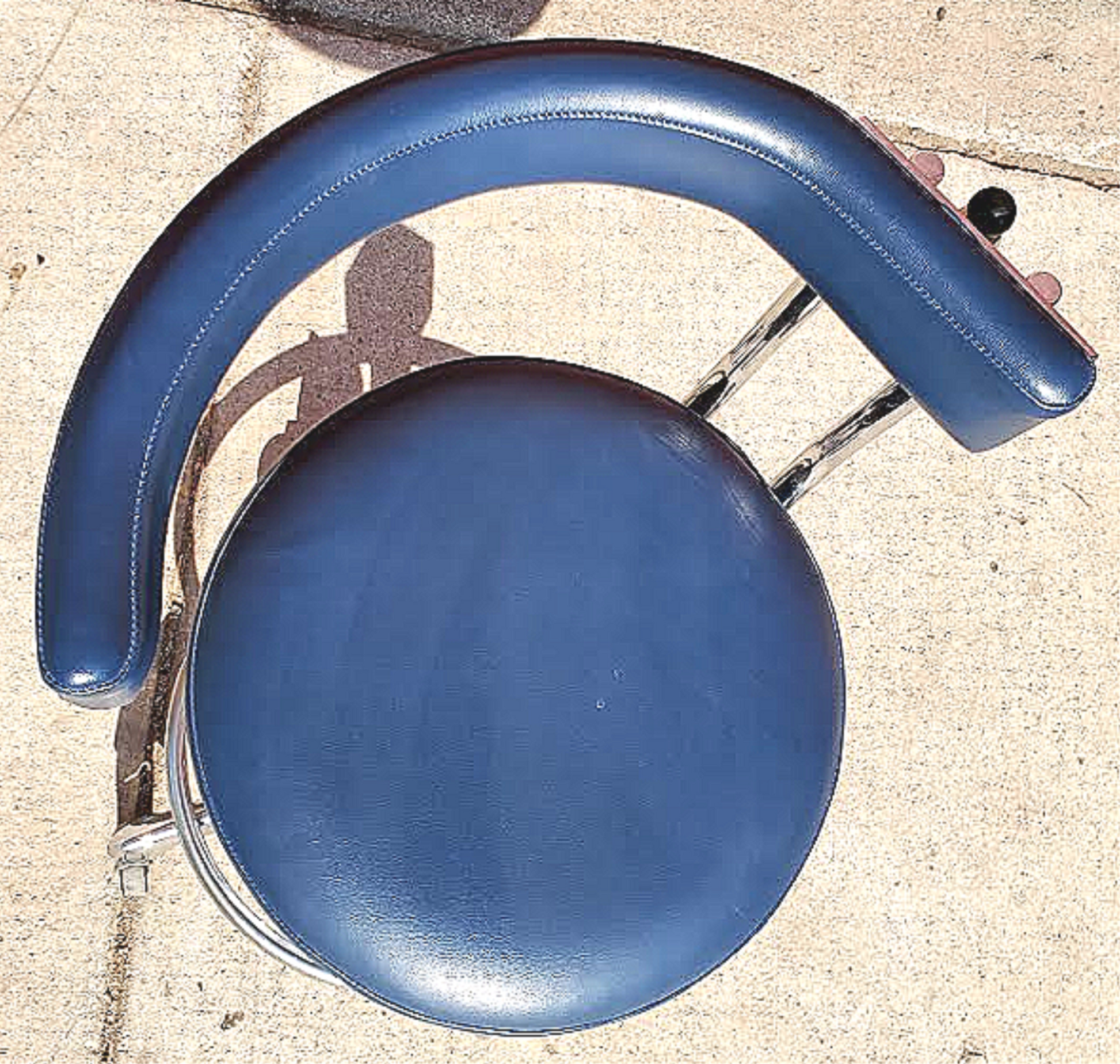 The chair/stool at its full height is about 28-29 inches at the seat and 20 inches at the lowest height, and the seat pad is about 15.5 inches diameter round. The chrome is EXCELLENT, wheels are great, Seams on the chair and rest do not have any rips nor tears as shown. Rest Back Metal bracket is in PERFECT condition.