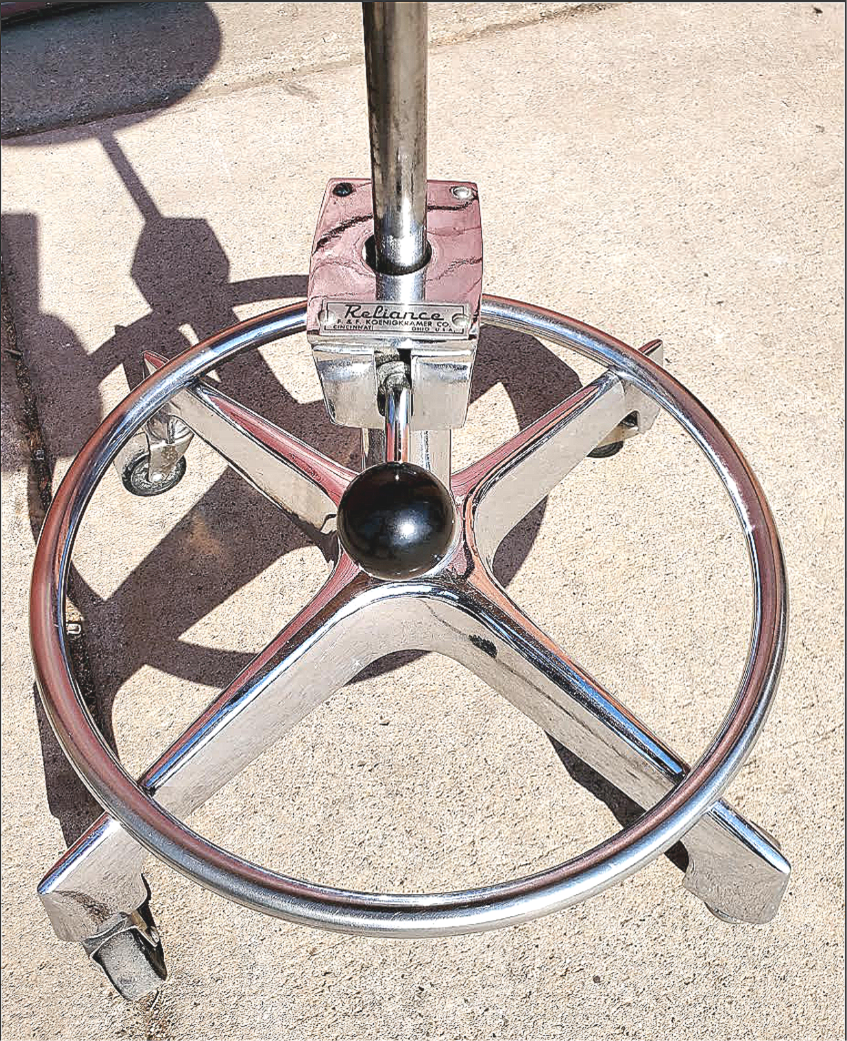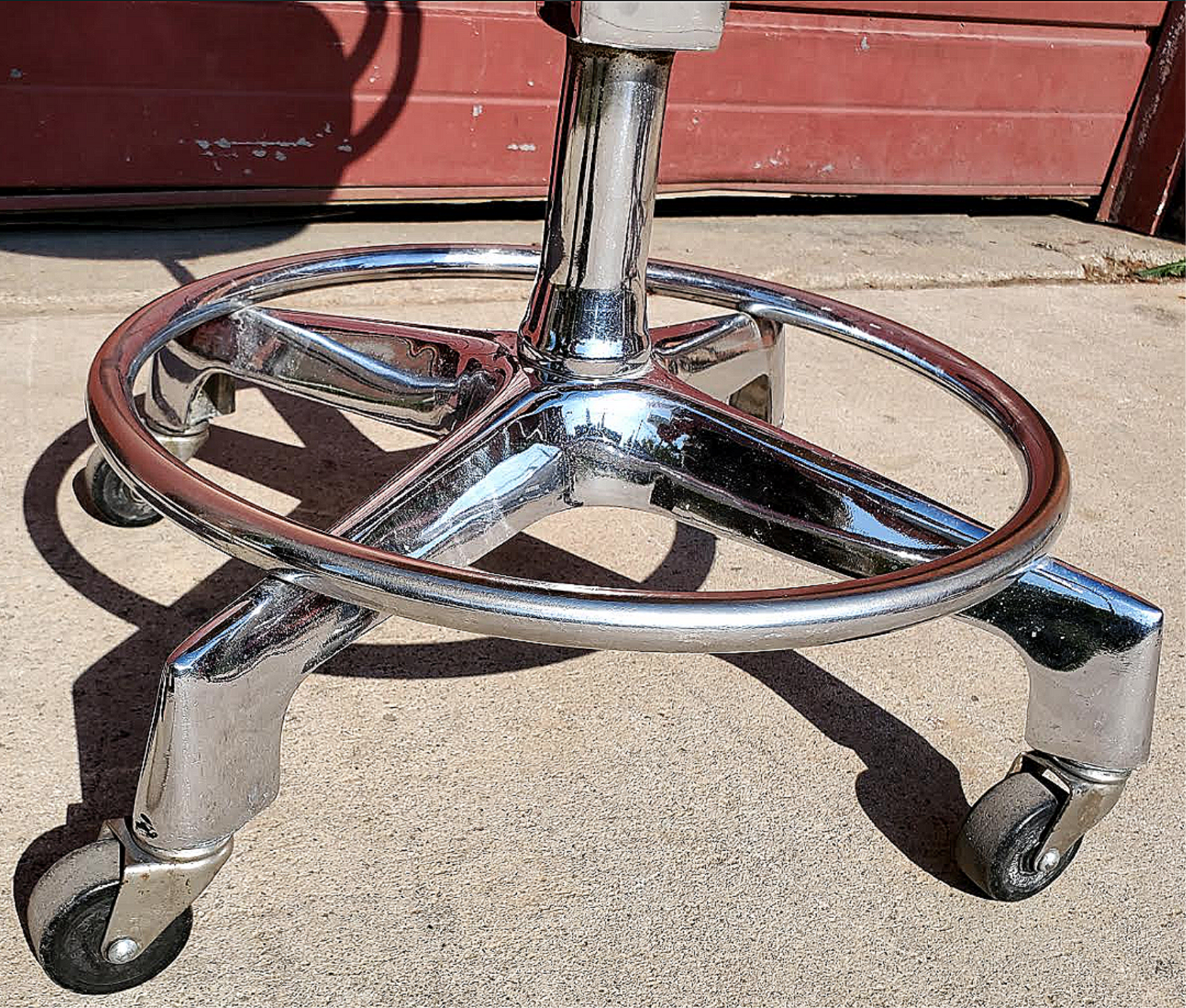 Details: Heavy chrome metal frame, rolling casters, wrap around arm, original metal tag