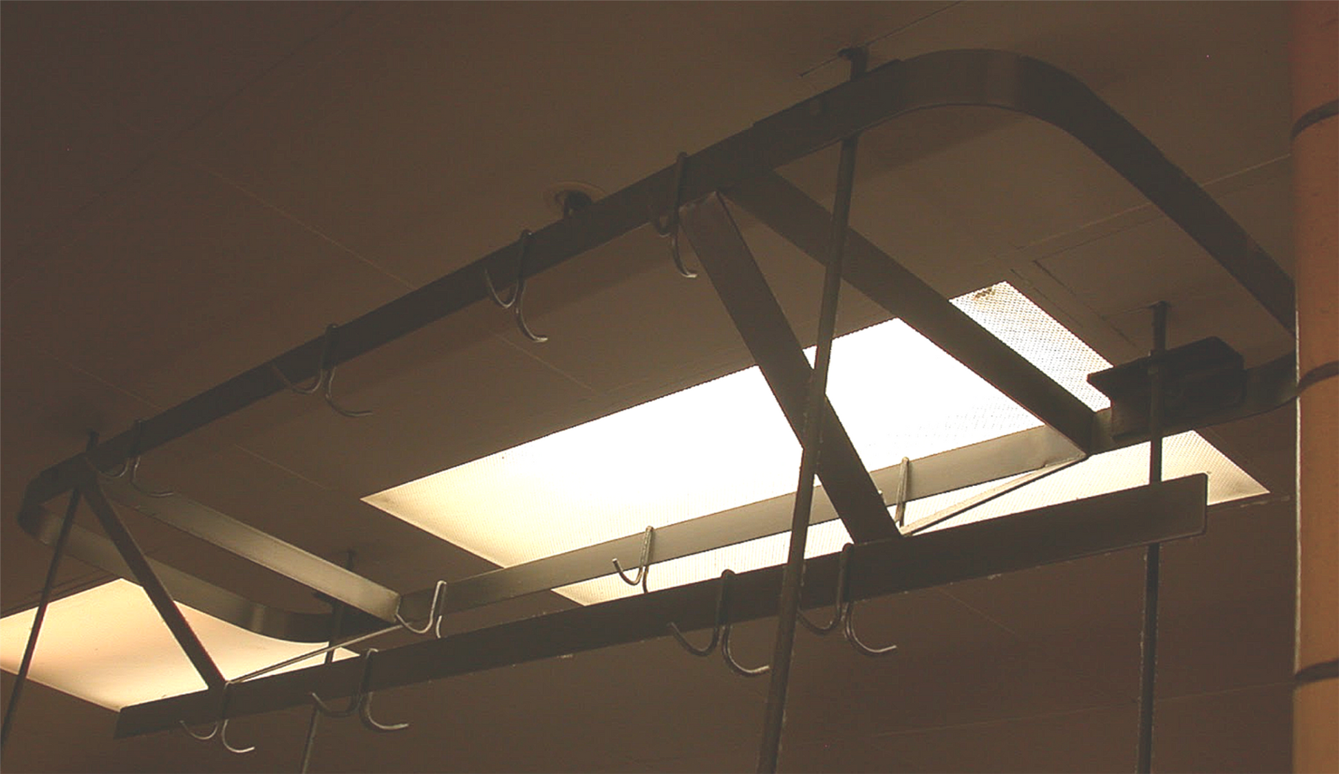 RARE VINTAGE 10FT WIDE STAINL STEEL KITCHEN POT HOLDER RACK BRASS HOOKS FREESHIP