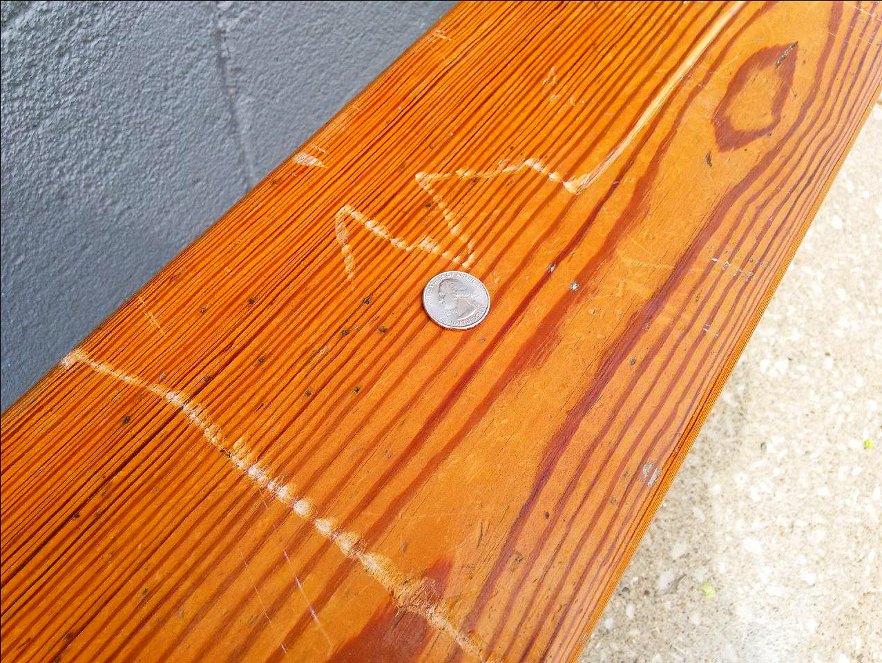 Butcher block Pine hardwood bench seat has a clear varnish seal.