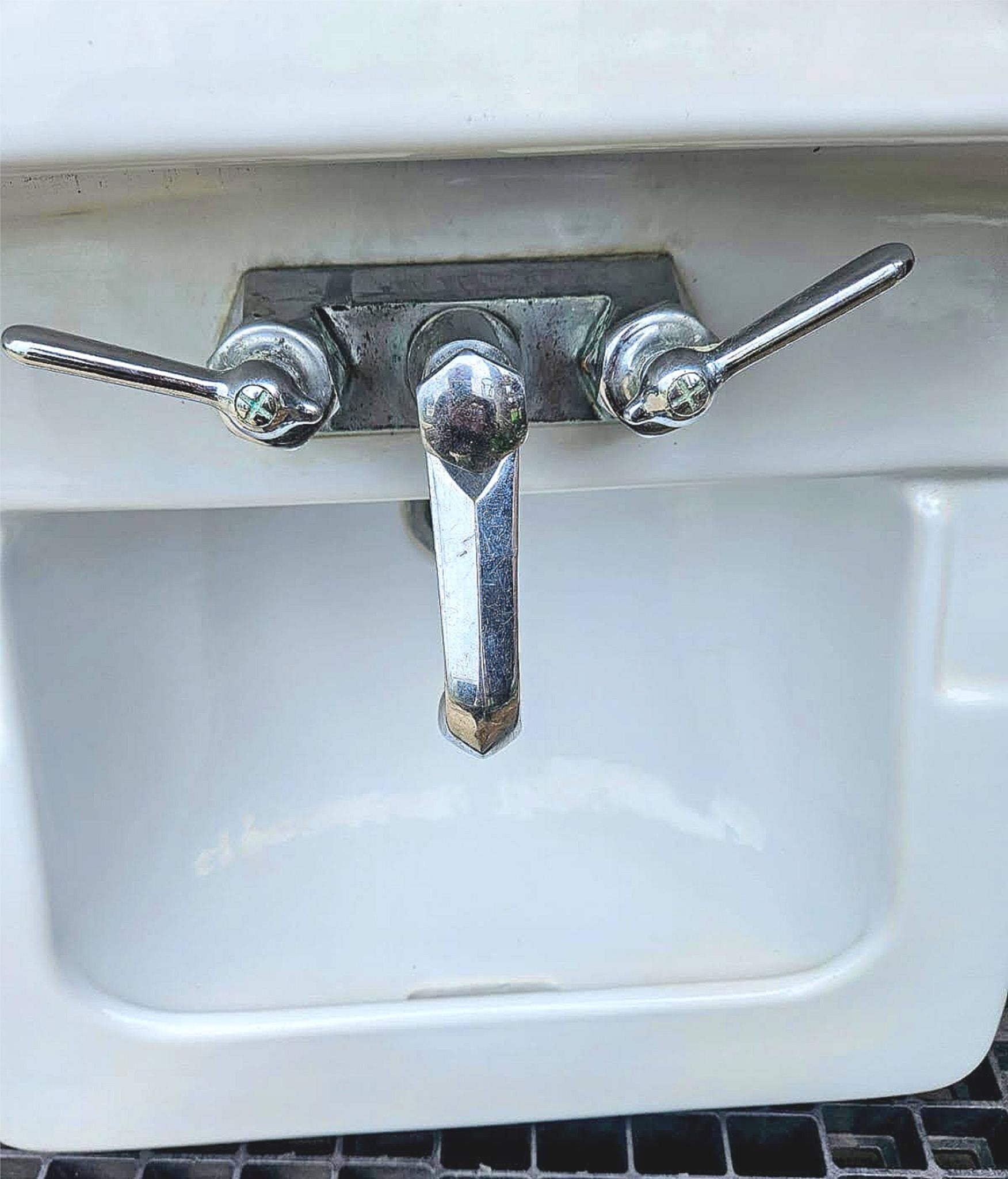 The sink is in very good condition with minimal wear as pictured, and still retains a few pieces of its possibly still functioning antique plumbing fixtures.