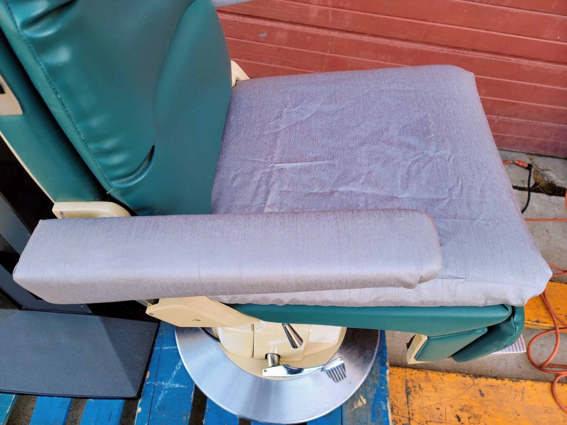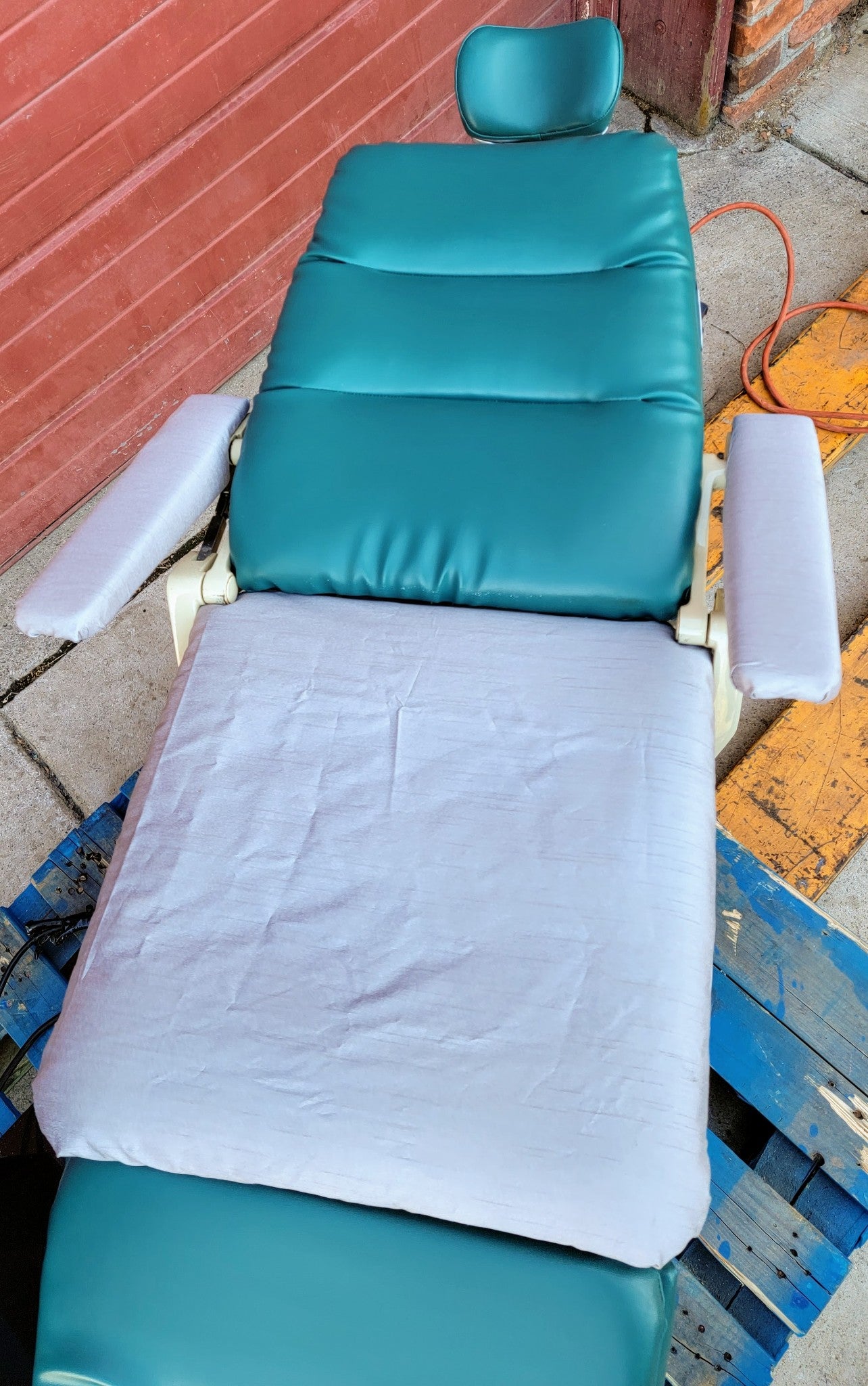 COSMETIC CONDITION: Both Arm Rests and Seat Cushion have been upholstered/covered with protective heavy duty Impermeable fabric as can be seen in the pictures. The Head Rest, Back Rest and Calf Rest are all in the Original Vinyl covering without any rips or tears as can also be seen in the pictures.