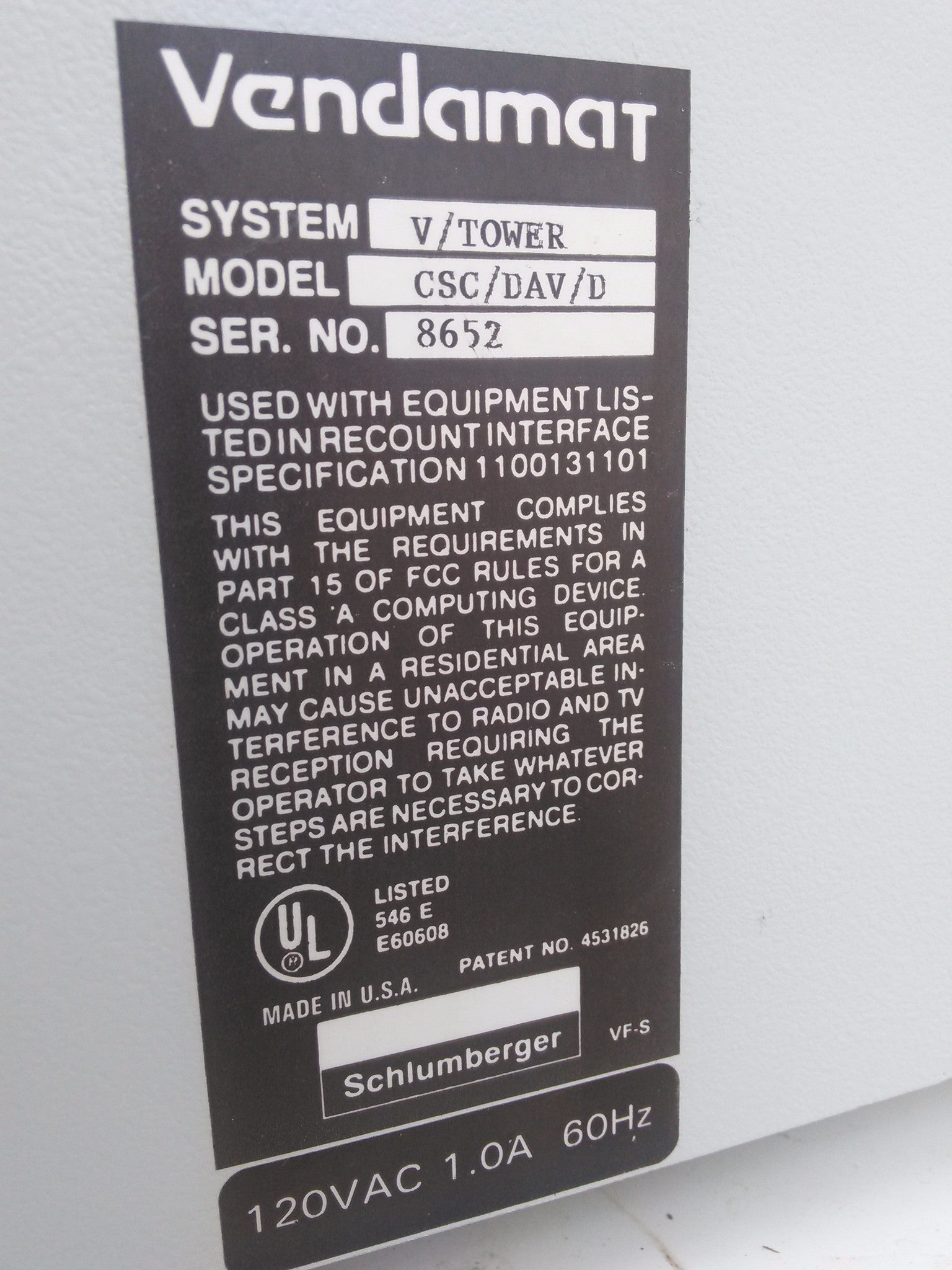 SCHLUBENGER VENDAMAT V/TOWER CSC/DAV/D VENDING BILL COPIER PRINTER MACHINE