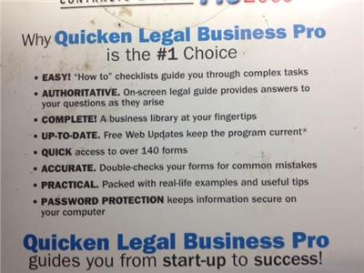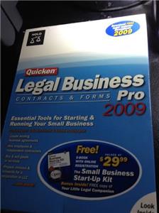 SIMPLY ANOTHER ITEM BY OVER 10 YEARS CONSULTANTS FOR EACH INDIVIDUAL EQUIPMENT OR SERVICE YOU MAY NEED WORLDWIDE! Nolo Quicken Legal Business Pro 2009 CONTRACTS AND FORMS Quicken Legal Business Pro 2009 Model Brand Nolo Features FeaturePlan for Success Select the best structure for your business, draft business contracts, get required documents and minimize the chances of legal disputes. Get the Forms You Need Choose from over 140 essential documents, contracts, letters, worksheets and more. Many of them are interactive -- just take a step-by-step interview, print the results and you're done! Become Tax Savvy Identify deductions allowed by the IRS, write off long-term business assets and minimize the chance of an audit. Build Your Team Hire workers, develop sensible personnel polices, minimize the chance of employee lawsuits and legally terminate workers when necessary. Negotiate a Lease Figure out how much space you need, choose a good location, negotiate the best possible terms, bargain for lower security deposits, share costs for repairs and expansion, and more! Get the Word Out Implement efficient and inexpensive marketing plans, price products for success, market online, and attract customers and clients. Quicken Legal Business Pro 2009Operating Systems SupportedWindowsPackagingRetailSystem RequirementsCD-ROM enclosed Computer: Pentium 133 (Pentium II 300 recommended) Operating System: Windows 2000 / XP / Vista Memory: 32 MB RAM (64 MB RAM recommended) Hard Disk Space: 35 MB (38 MB to install) Monitor: Super VGA (800x600) with 256 colors (16-bit color recommended) CD-ROM drive: 2X Speed Internet Connection: 14.4 Kbps modem required to access online features (56 Kbps or higher recommended) Printer: Any printer supported by Windows 2000 / XP / Vista Software: Microsoft Internet Explorer 5.0 or higher. Adobe Acrobat Reader. -