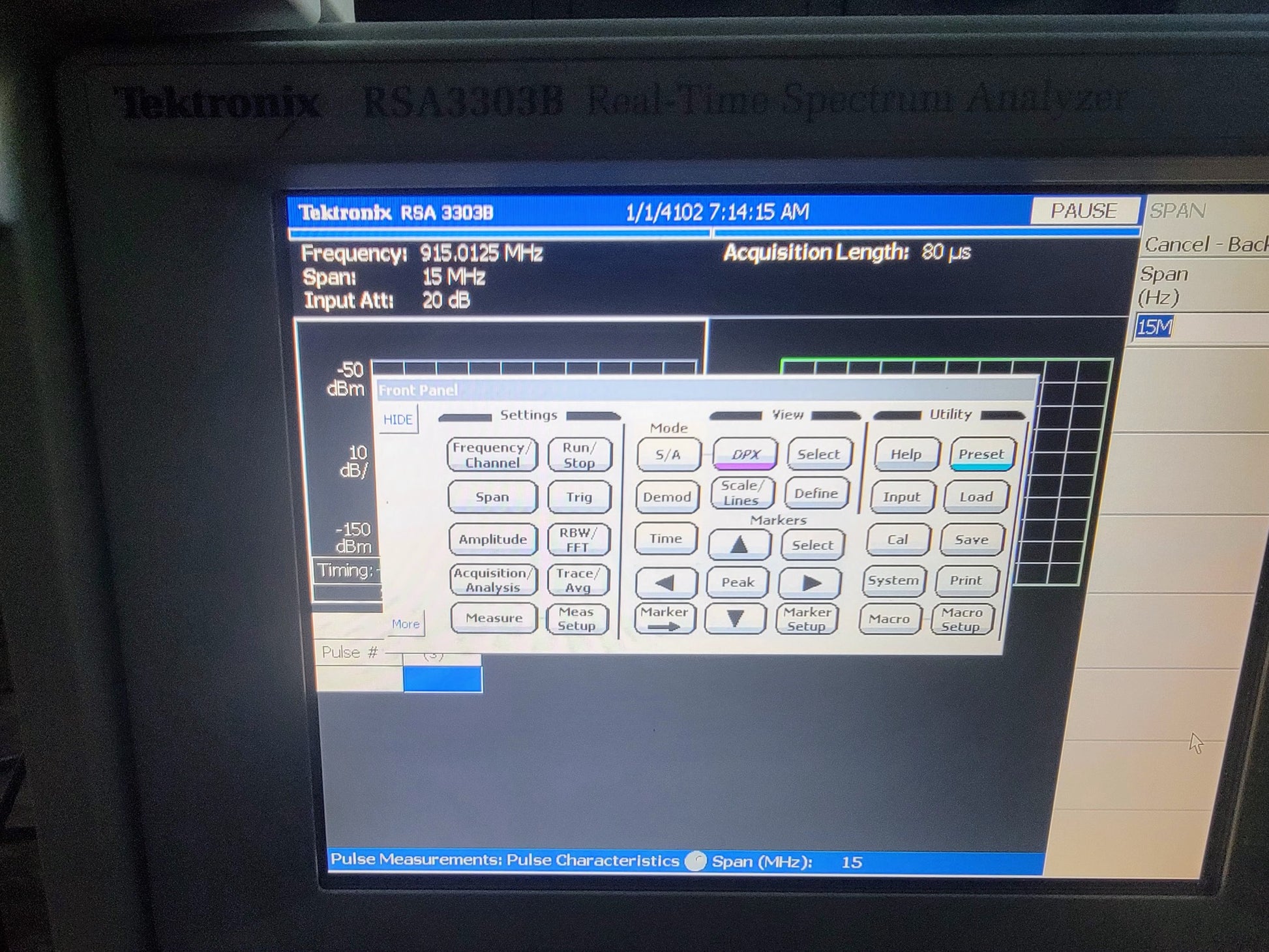 The RSA3303B is a portable Real-time Spectrum Analyzer (RSA) meant for lab or production line use with a frequency range of DC to 3 GHz is capable of capturing continuous, intermittent, or random signals. With Digital phosphor spectrum processing (DPX) this RSA provides the user the ability to view time-varying RF signals with color-graded displays based on frequency. For offline spectral analysis, .iqt and .tiq waveform data files can be offloaded to RSAVu Real-Time Spectrum Analyzer Software running on a PC.