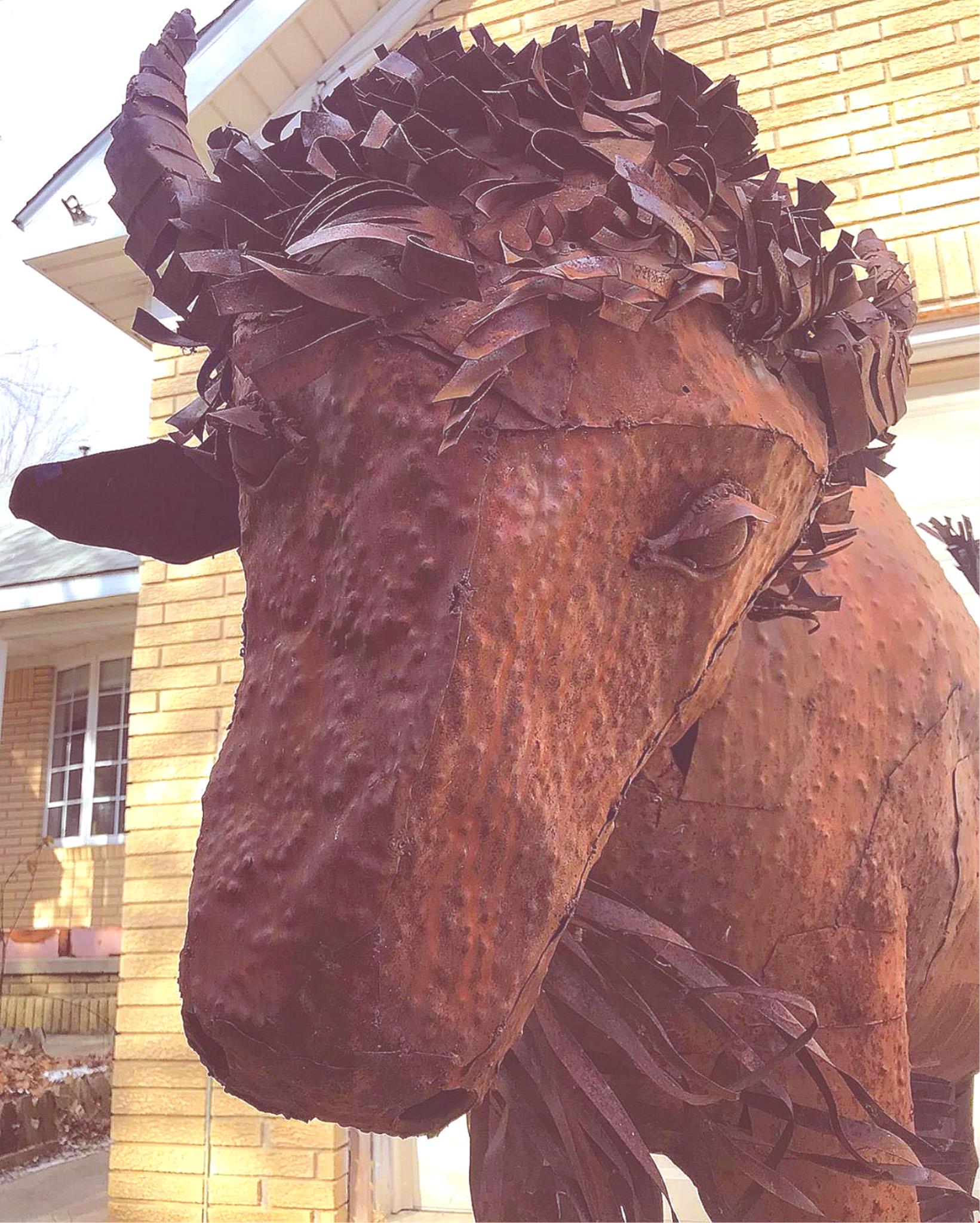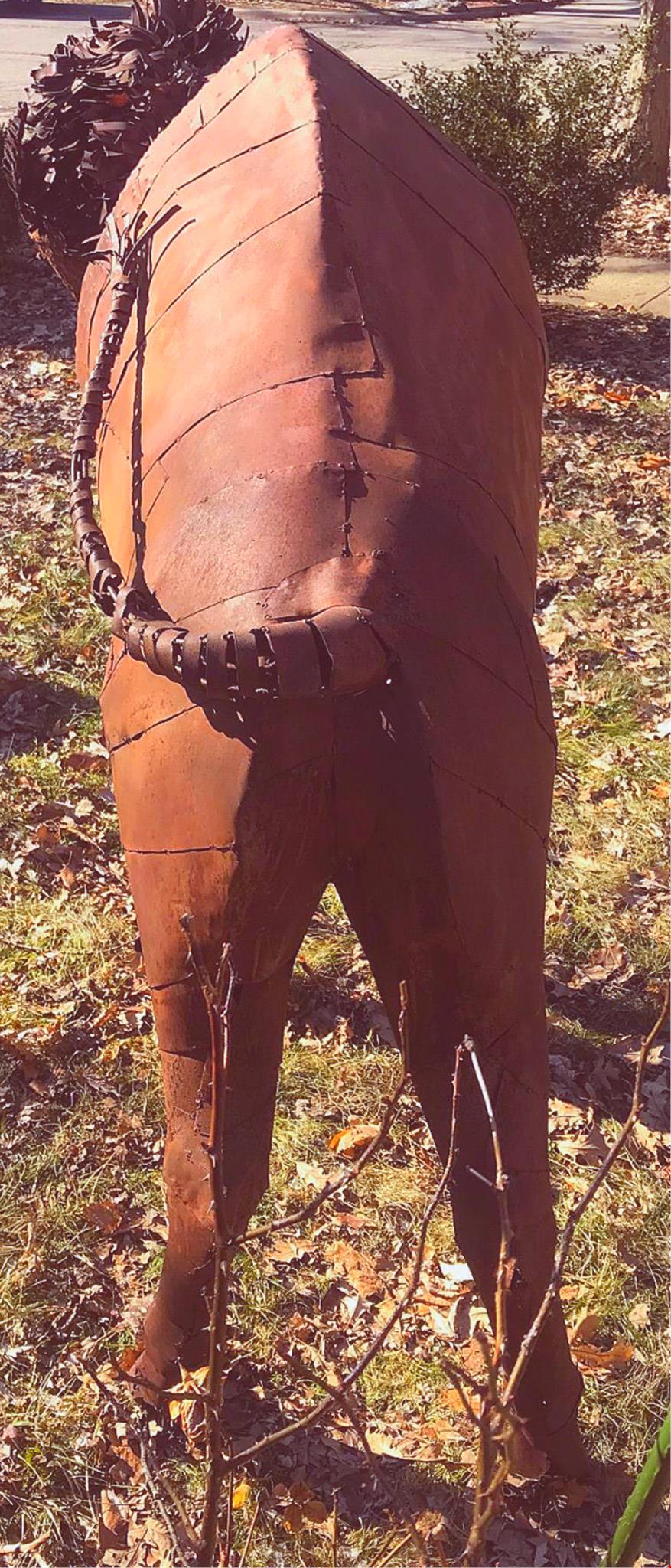 This Sculpture belonged to an alumni from THE UNIVERSITY OF COLORADO who bought it off a Colorado artist who made it to celebrate RALPHIE the UNIVERSITY OF COLORADO FOOTBAL MASCOT so we think it was made by a metal artist from Colorado. We could not find any author autograph inscription on it.