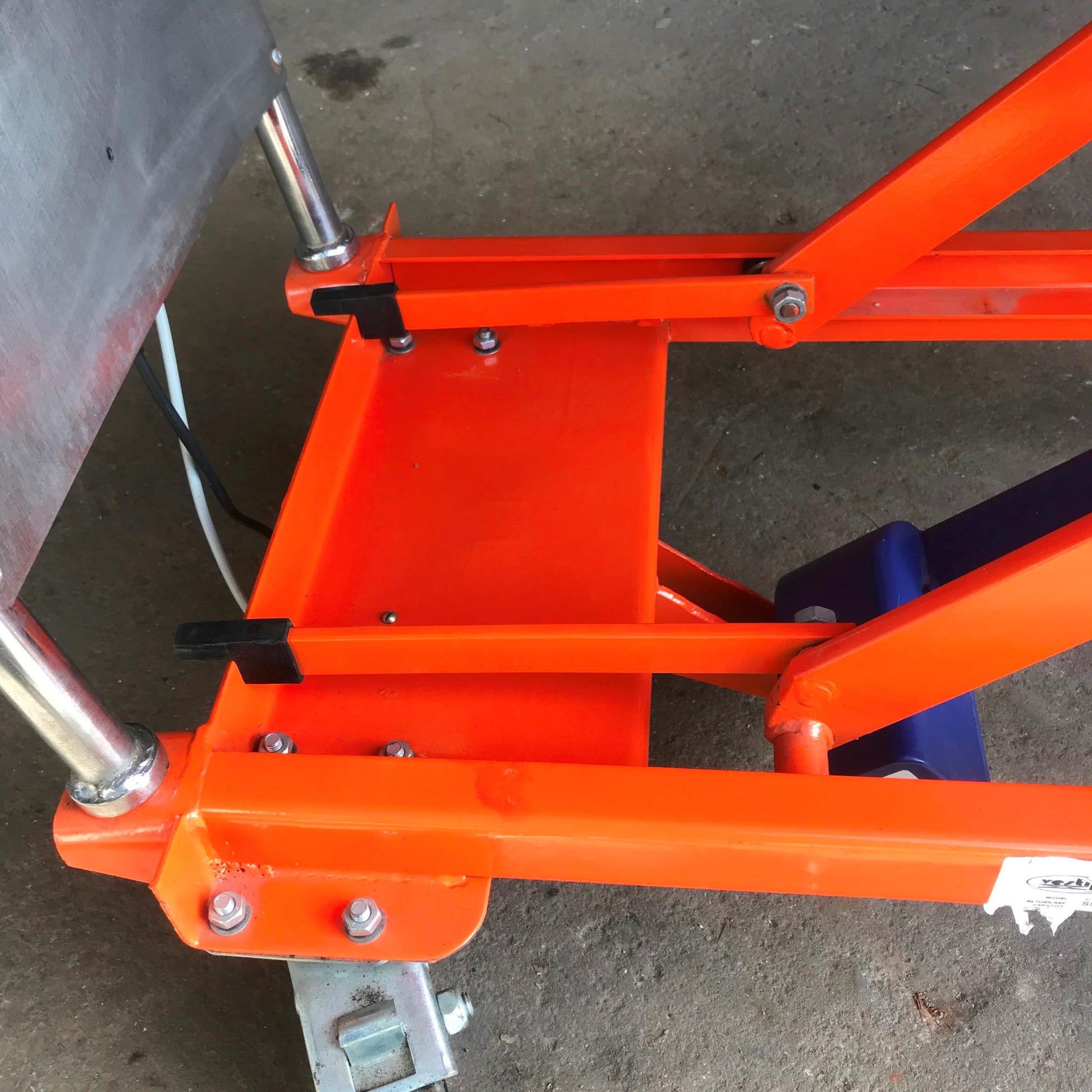 Scissor Lift features ½" steel plate scissor legs, lifetime lubricated bearings and a hinged platform for convenient cylinder access.