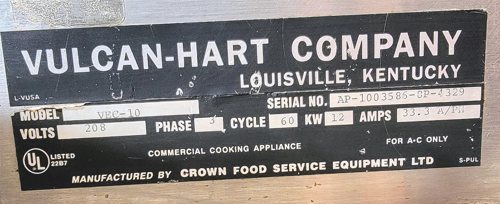 This listing is for a Great working Condition ORIGINAL VULCAN-HART VEC-10 ELECTRIC 3-PHASE 10 GALLON KETTLE with MANUAL as can be Seen in the Pictures.
