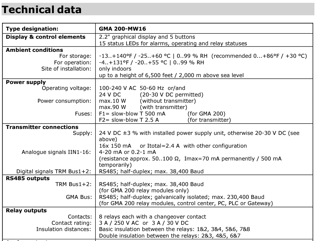 Device design Up to 16 transmitters can be connected to the analog inputs of the GMA 200-MW16 gas detection controller with 4-20 mA or 0.2-1 mA output. A microprocessor evaluates the analog input signals of the connected transmitters, and a clearly structured display with LEDs indicate the status of the gas detection controller, each measuring point and the relays.
