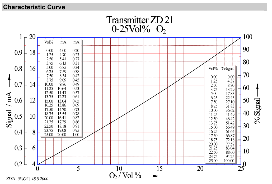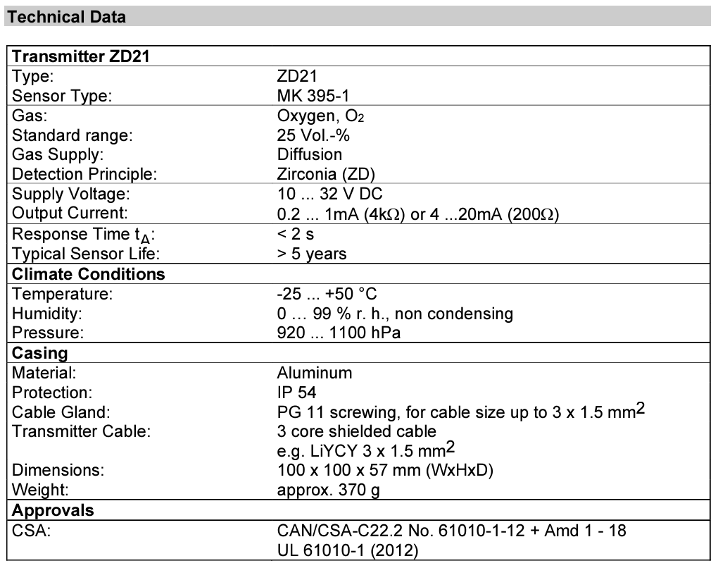 Technical Data Transmitter ZD21 Type: ZD21 Sensor Type: MK 395-1 Gas: Oxygen, O2 Standard range: 25 Vol.-% Gas Supply: Diffusion Detection Principle: Zirconia (ZD) Supply Voltage: 10 ... 32 V DC Output Current: 0.2 ... 1mA (4kΩ) or 4 ...20mA (200Ω) Response Time tA: < 2 s Typical Sensor Life: > 5 years Climate Conditions Temperature: -25 ... +50 °C Humidity: 0 … 99 % r. h., non condensing Pressure: 920 ... 1100 hPa Casing Material: Aluminum Protection: IP 54 Cable Gland: PG 11 screwing, for cable size up to 3 x 1.5 mm2 Transmitter Cable: 3 core shielded cable e.g. LiYCY 3 x 1.5 mm2 Dimensions: 100 x 100 x 57 mm (WxHxD) Weight: approx. 370 g Approvals CSA: CAN/CSA-C22.2 No. 61010-1-12 + Amd 1 - 18 UL 61010-1 (2012)